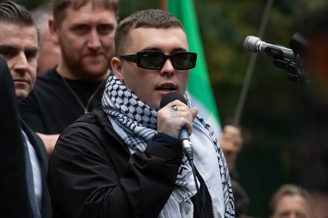(Mo Chara (Liam Óg Ó hAnnaidh) of Northern Irish trio Kneecap speaks to the crowd at Woolwich Crown Court in London, England, UK on Friday 26 September, 2025 after judges dismissed a Terrorism charge against him., Credit:Justin Ng / Avalon