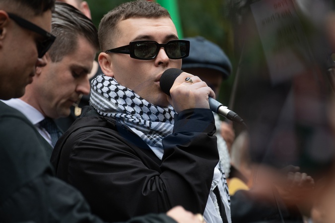 (Mo Chara (Liam Óg Ó hAnnaidh) of Northern Irish trio Kneecap speaks to the crowd at Woolwich Crown Court in London, England, UK on Friday 26 September, 2025 after judges dismissed a Terrorism charge against him., Credit:Justin Ng / Avalon