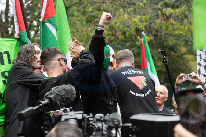 (DJ Próvai ( J. J. Ó Dochartaigh) of Northern Irish trio Kneecap salutes the crowd at Woolwich Crown Court in London, England, UK on Friday 26 September, 2025 after judges dismissed a Terrorism charge against him., Credit:Justin Ng / Avalon
