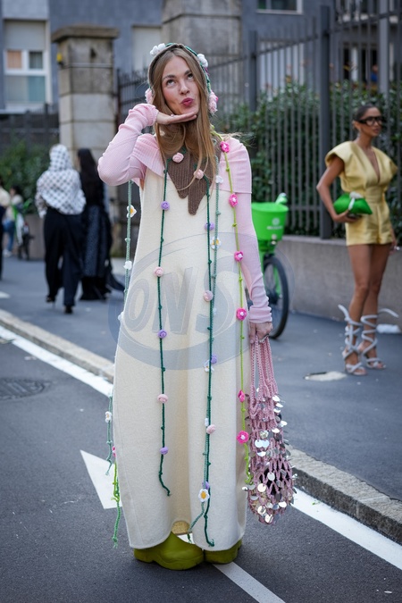 Street Style: A guest is seen outside of the Moschino fashion show during the Milan Fashion Week Womenswear Spring/Summer 2026 in Milan, Italy on 25 September 2025., Credit:Stefano Costantino TTL / Avalon
