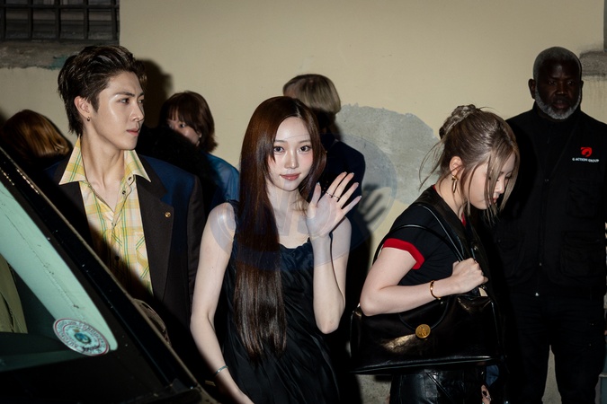 Members of the Allay Project, ADP, South Korean group, (L toR) Woochan, Youngseo, and Bailey are seen outside of the Versace fashion show during the Milan Fashion Week Womenswear Spring/Summer 2026 in Milan, Italy on 26 September 2025., Credit:Stefano Costantino TTL / Avalon