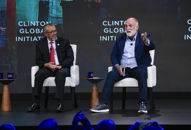 Tedros Adhanom Ghebreyesus Director General World Health Organization, Jose Andres during the 2025 Clinton Global Initiative, held at the New York Hilton in New York City, Thursday, September 25, 2025., Credit:Jennifer Graylock-Graylock.com / Avalon