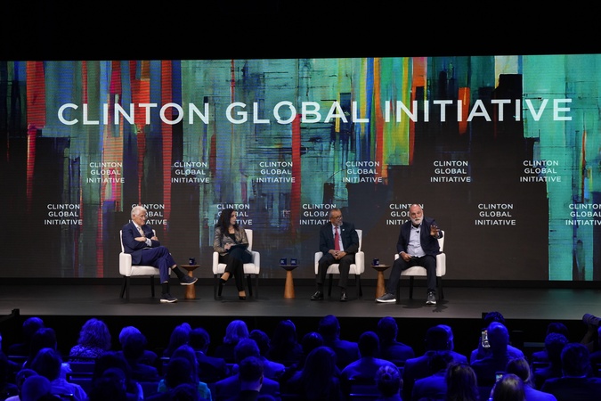 L-R: President Bill Clinton, Vjosa Osmani President of Kosovo, Tedros Adhanom Ghebreyesus Director General World Health Organization, Jose Andres during the 2025 Clinton Global Initiative, held at the New York Hilton in New York City, Thursday, September 25, 2025., Credit:Jennifer Graylock-Graylock.com / Avalon