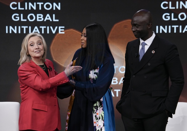 Hillary Clinton, Mo Abudu CEO EbonyLife Group, Wemimo Abbey Co-Founder Esusu Inc during the 2025 Clinton Global Initiative, held at the New York Hilton in New York City, Thursday, September 25, 2025., Credit:Jennifer Graylock-Graylock.com / Avalon