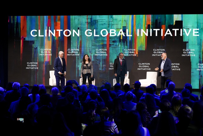 President Bill Clinton, Vjosa Osmani President of Kosovo, Tedros Adhanom Ghebreyesus Director General World Health Organization, Jose Andres during the 2025 Clinton Global Initiative, held at the New York Hilton in New York City, Thursday, September 25, 2025., Credit:Jennifer Graylock-Graylock.com / Avalon