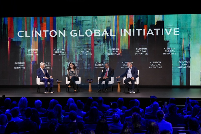 L-R: President Bill Clinton, Vjosa Osmani President of Kosovo, Tedros Adhanom Ghebreyesus Director General World Health Organization, Jose Andres during the 2025 Clinton Global Initiative, held at the New York Hilton in New York City, Thursday, September 25, 2025., Credit:Jennifer Graylock-Graylock.com / Avalon