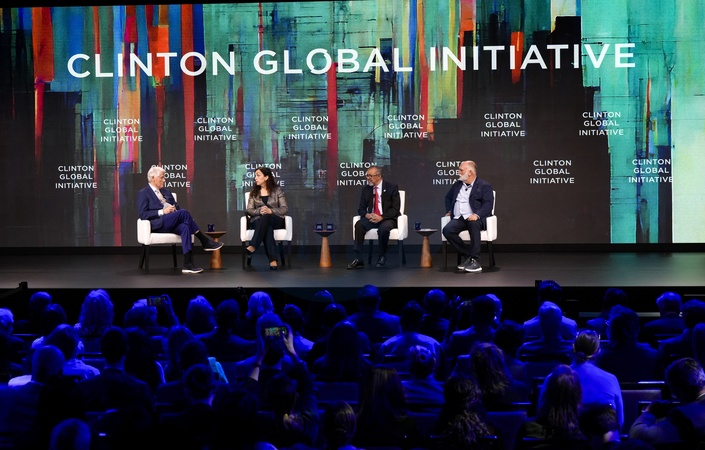 L-R: President Bill Clinton, Vjosa Osmani President of Kosovo, Tedros Adhanom Ghebreyesus Director General World Health Organization, Jose Andres during the 2025 Clinton Global Initiative, held at the New York Hilton in New York City, Thursday, September 25, 2025., Credit:Jennifer Graylock-Graylock.com / Avalon