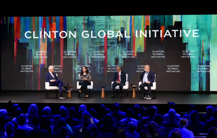 L-R: President Bill Clinton, Vjosa Osmani President of Kosovo, Tedros Adhanom Ghebreyesus Director General World Health Organization, Jose Andres during the 2025 Clinton Global Initiative, held at the New York Hilton in New York City, Thursday, September 25, 2025., Credit:Jennifer Graylock-Graylock.com / Avalon