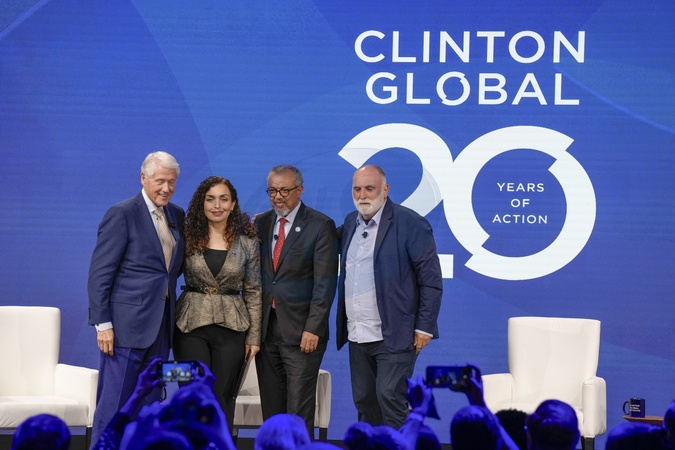 L-R: President Bill Clinton, Vjosa Osmani President of Kosovo, Tedros Adhanom Ghebreyesus Director General World Health Organization, Jose Andres during the 2025 Clinton Global Initiative, held at the New York Hilton in New York City, Thursday, September 25, 2025., Credit:Jennifer Graylock-Graylock.com / Avalon
