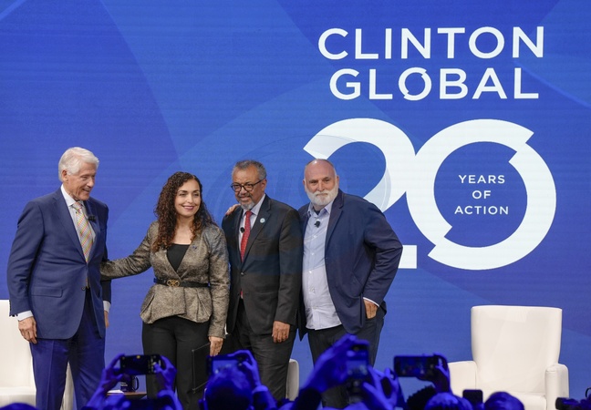L-R: President Bill Clinton, Vjosa Osmani President of Kosovo, Tedros Adhanom Ghebreyesus Director General World Health Organization, Jose Andres during the 2025 Clinton Global Initiative, held at the New York Hilton in New York City, Thursday, September 25, 2025., Credit:Jennifer Graylock-Graylock.com / Avalon