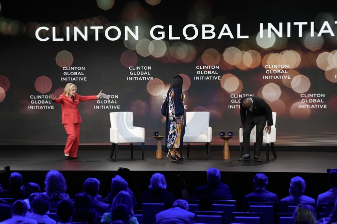 Hillary Clinton, Mo Abudu CEO EbonyLife Group, Wemimo Abbey Co-Founder Esusu Inc during the 2025 Clinton Global Initiative, held at the New York Hilton in New York City, Thursday, September 25, 2025., Credit:Jennifer Graylock-Graylock.com / Avalon