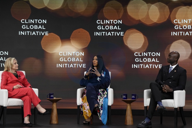Hillary Clinton, Mo Abudu CEO EbonyLife Group, Wemimo Abbey Co-Founder Esusu Inc during the 2025 Clinton Global Initiative, held at the New York Hilton in New York City, Thursday, September 25, 2025., Credit:Jennifer Graylock-Graylock.com / Avalon
