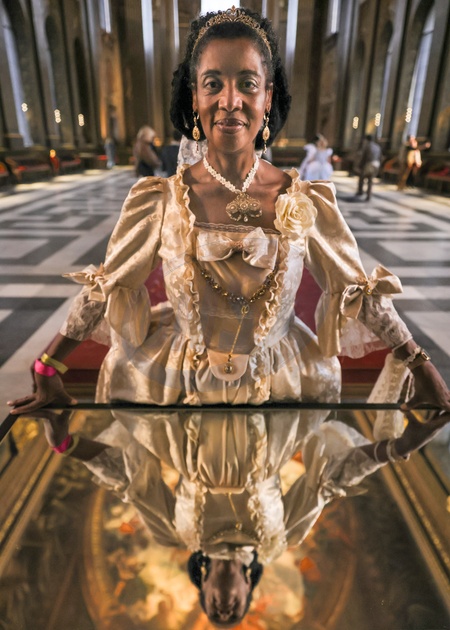 London, UK, 27th Sep 2025. Phaendra as Queen Charlotte from Bridgerton poses in the stunning Painted Hall. Iconic screen characters take over the Old Rotal Nanal College grounds, Painted Hall and courtyards, in a Film100 cinematic celebration and Guinness World Record attempt for the largest number of people dressed as TV and film characters gathered. The marks 100 years of filmmaking on-site for the Old Royal Naval College and Elstree Studios., Credit:Imageplotter / Avalon