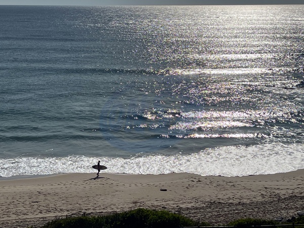 Aerial landscape view of unrecognizable wave surfer silhouette carry a surf board while walking on a sandy beach alone, Credit:Rafael Ben Ari / Avalon