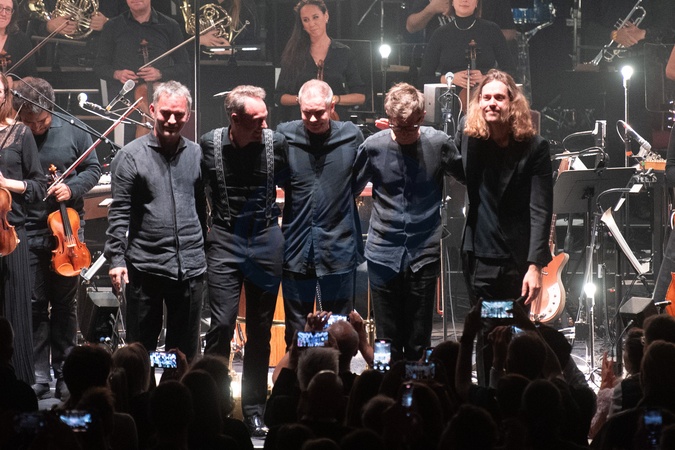 (L-R) - keyboardist Kjartan Sveinsson, lead singer/guitarist Jónsi Birgisson and bassist Georg Hólm of Icelandic band Sigur Ros, and conductor Robert Ames (Right) take a bow at Royal Albert Hall, London, England, UK on Tuesday 30 September 2025 as part of their 2025 European and UK Orchestra Tour., Credit:Justin Ng / Avalon