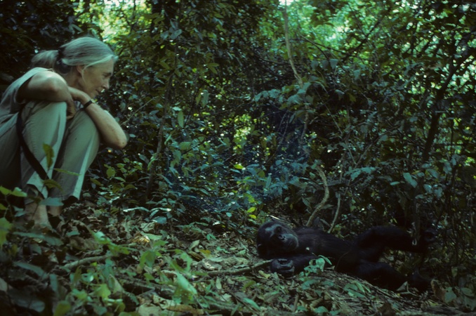 Jane Goodall Personality personalities, celebrity, july, 1994, with monkey, ape, gorilla, female, chimpanzee, in wild, jungle, communicating, socializing, Credit:Karl & Kay Amman / Avalon
