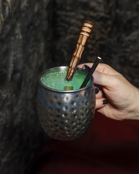 Contraband Cauldron with Gordon's gin, Bottle Greenelderflower cordial, Funkin lemon and lime juice, Monin cucumber syrup, R Whites lemonade and Schweppes soda water at Hexmoor: Wizarding Prison in Shoreditch, London, Credit:Mario Mitsis / Avalon