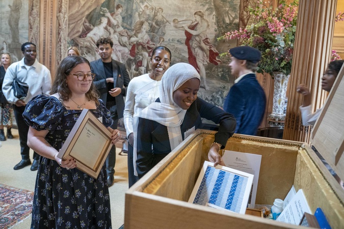 People place items in a time capsule during an event attended by King Charles III at Dumfries House in Cumnock, to celebrate the King's Foundation's '35 under 35 network', and highlight the creativity and innovation of young changemakers representing the foundation's work across diverse fields. Picture date: Thursday October 2, 2025., Credit:Jane Barlow / Avalon