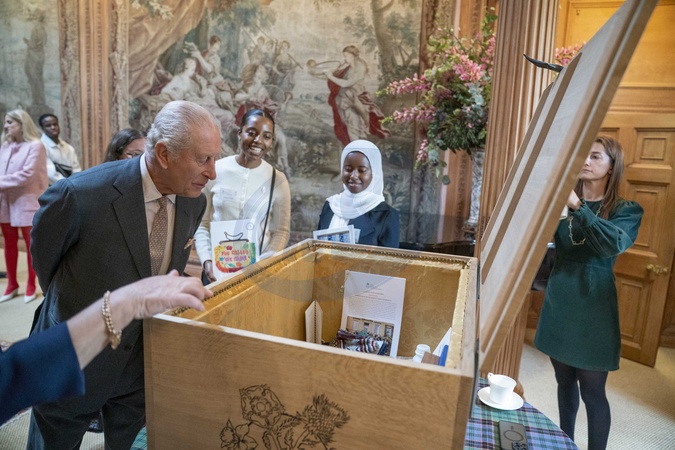 King Charles III takes a look inside a time capsule during an event at Dumfries House in Cumnock, to celebrate the King's Foundation's '35 under 35 network', and highlight the creativity and innovation of young changemakers representing the foundation's work across diverse fields. Picture date: Thursday October 2, 2025., Credit:Jane Barlow / Avalon