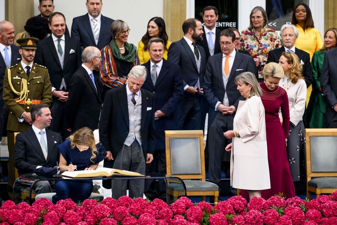 Luxemburg, The Netherlands, 2025-10-03 13:12:29LUXEMBOURG, 03-10-2025, City Hall Abdication of His Royal Highness Grand Duke Henri and the installation of His Royal Highness Hereditary Grand Duke Guillaume PHOTO: NLBeeld/Patrick van EmstIn the photo: Grand Duke Guillaume of Luxembourg and Duchess Stéphanie, King Willem-Alexander, Queen Máxima and the Princess of Orange, King Philippe of Belgium with Queen Mathilde and Crown Princess Elisabeth, Credit:Avalon