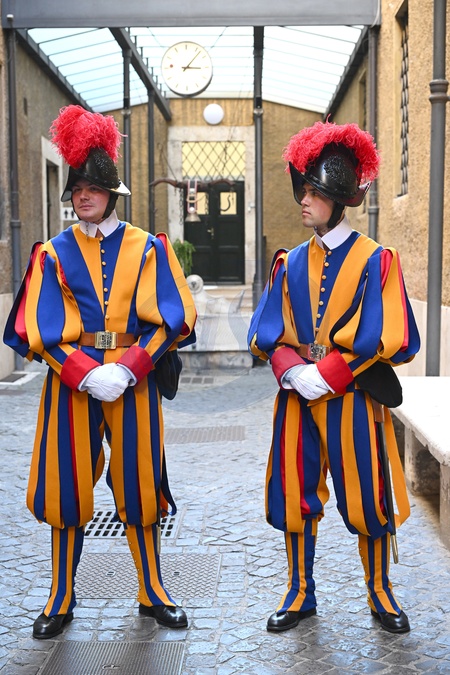 Swiss Guards keeps watch during the unveiling of the updated Swiss Guards representative uniform, called the 'Half Gala' uniform, in the Guest Cellar at the Swiss Guards Corp Barracks in Vatican City, 02 October 2025., Credit:Maria Laura Antonelli / Avalon