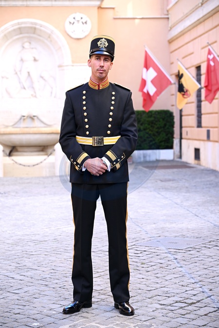 The updated Swiss Guards representative uniform, called the 'Half Gala' uniform, is presented in the Guest Cellar at the Swiss Guards Corp Barracks in Vatican City, 02 October 2025., Credit:Maria Laura Antonelli / Avalon