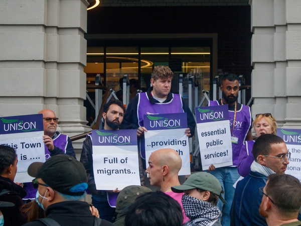 Protesters from Stand Up To Racism and other groups outside of Tower Hamlets Town Hall, London, UK, 8 October 2025, Credit:Alex Day / Avalon