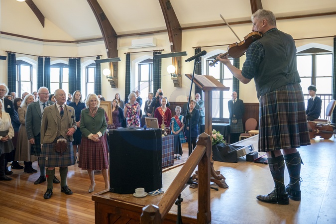 King Charles III and Queen Camilla watching the first performance of a fiddle tune composed by local musician Dr Paul Anderson, during a visit to mark the 150th anniversary of The Albert Hall in Ballater, Aberdeenshire. Picture date: Thursday October 9, 2025., Credit:Avalon.red / Avalon