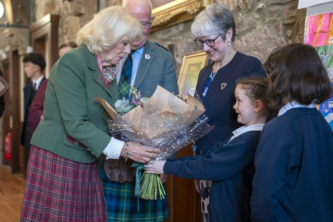 Pupils from Ballater School present flowers to Queen Camilla during a visit to mark the 150th anniversary of The Albert Hall in Ballater, Aberdeenshire. Picture date: Thursday October 9, 2025., Credit:Avalon.red / Avalon
