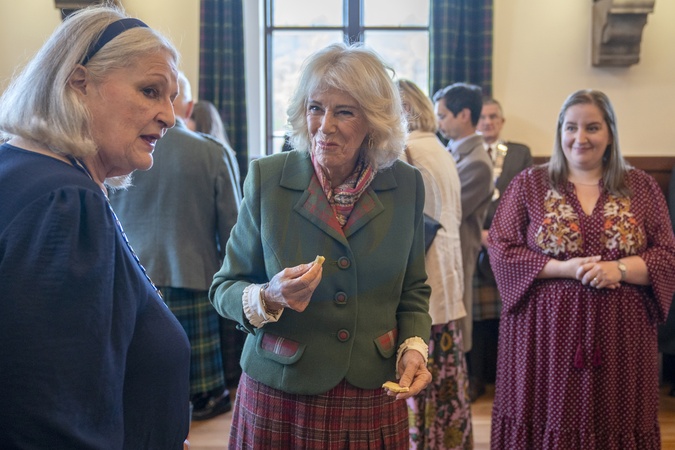 Queen Camilla tastes some locally made shortbread during a visit to mark the 150th anniversary of The Albert Hall in Ballater, Aberdeenshire. Picture date: Thursday October 9, 2025., Credit:Avalon.red / Avalon