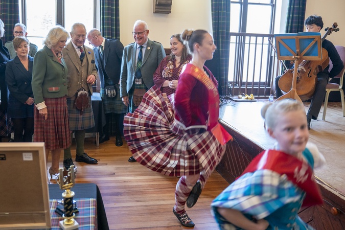 King Charles III and Queen Camilla watch some Highland dancing during a visit to mark the 150th anniversary of The Albert Hall in Ballater, Aberdeenshire. Picture date: Thursday October 9, 2025., Credit:Avalon.red / Avalon