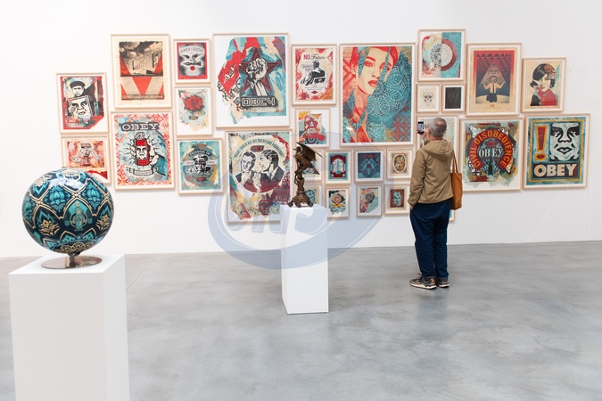 A visitor views Works by Shepard Fairey at 'Triple Trouble' - an exhibition of new collaborative works by Shepard Fairey, Damien Hirst and Invader at Newport Street Gallery, London, England, UK on Thursday 9 October, 2025., Credit:Justin Ng / Avalon