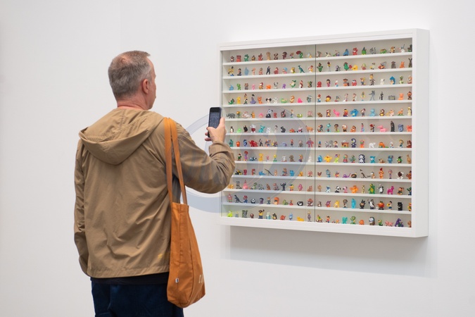 A visitor views 'Triple Trouble Toys Cabinet' (2025) by Invader at 'Triple Trouble' - an exhibition of new collaborative works by Shepard Fairey, Damien Hirst and Invader at Newport Street Gallery, London, England, UK on Thursday 9 October, 2025., Credit:Justin Ng / Avalon