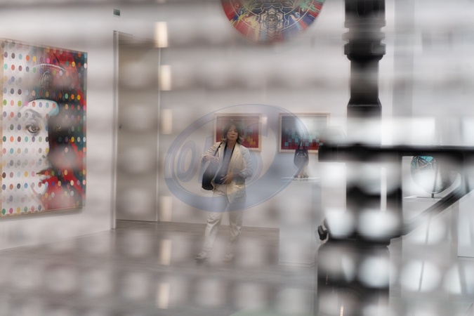 A visitor views 'Invade' (2025) by Invader at 'Triple Trouble' - an exhibition of new collaborative works by Shepard Fairey, Damien Hirst and Invader at Newport Street Gallery, London, England, UK on Thursday 9 October, 2025., Credit:Justin Ng / Avalon