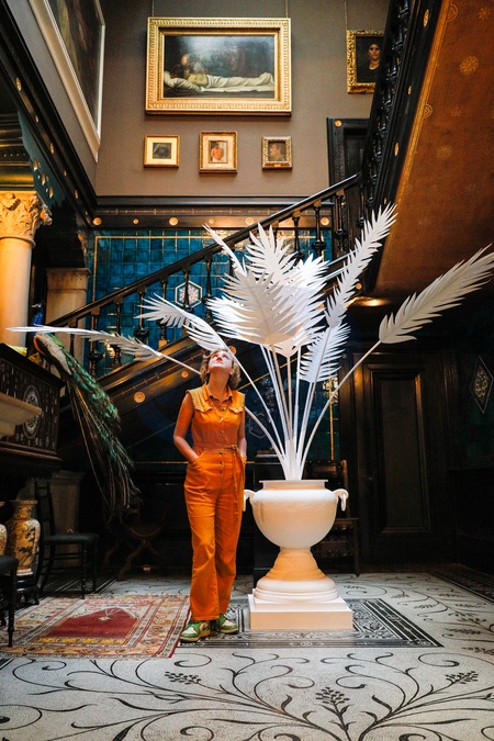 London, UK. 09th Oct 2025. Artist Annemarieke Kloosterhof in the grand staircase with one of four 'Ghost Objects' from Leighton's original collection, in their original place,but intricately handcrafted in white paper, featuring hand-cut details and using techniques like layering, embossing and sculpting - here a palm tree. Leighton House is marking 100 years since the former home of Victorian artist Frederic Leighton first opened to the public as a museum. As part of the celebrations, new life-sized paper artworks by Annemarieke Kloosterhof are also revealed set against the stunning historic interiors., Credit:Imageplotter / Avalon