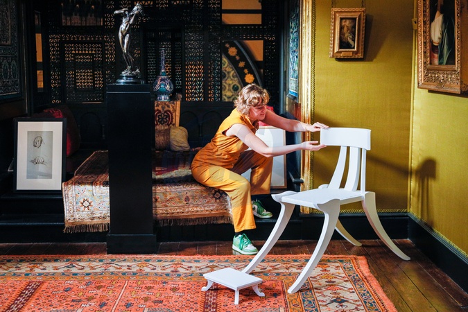London, UK. 09th Oct 2025. Artist Annemarieke Kloosterhof with one of four 'Ghost Objects' from Leighton's original collection, in their original place,but intricately handcrafted in white paper, featuring hand-cut details and using techniques like layering, embossing and sculpting - here a chair. Leighton House is marking 100 years since the former home of Victorian artist Frederic Leighton first opened to the public as a museum. As part of the celebrations, new life-sized paper artworks by Annemarieke Kloosterhof are also revealed set against the stunning historic interiors., Credit:Imageplotter / Avalon