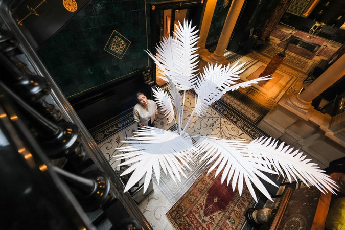 London, UK. 09th Oct 2025. Staff with one of four 'Ghost Objects' from Leighton's original collection, in their original place,but intricately handcrafted in white paper, featuring hand-cut details and using techniques like layering, embossing and sculpting - here a palm tree. Leighton House is marking 100 years since the former home of Victorian artist Frederic Leighton first opened to the public as a museum. As part of the celebrations, new life-sized paper artworks by Annemarieke Kloosterhof are also revealed set against the stunning historic interiors., Credit:Imageplotter / Avalon