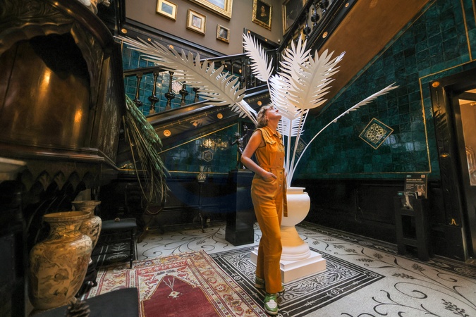 London, UK. 09th Oct 2025. Artist Annemarieke Kloosterhof in the grand staircase with one of four 'Ghost Objects' from Leighton's original collection, in their original place,but intricately handcrafted in white paper, featuring hand-cut details and using techniques like layering, embossing and sculpting - here a palm tree. Leighton House is marking 100 years since the former home of Victorian artist Frederic Leighton first opened to the public as a museum. As part of the celebrations, new life-sized paper artworks by Annemarieke Kloosterhof are also revealed set against the stunning historic interiors., Credit:Imageplotter / Avalon