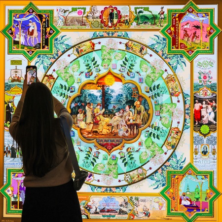 London, UK. 09th Oct 2025. TA visitor takes photos of 'Cinchona: What's in a Name', 2025. At the Shirley Sherwood Gallery of Botanical Art, Kew Gardens, new exhibitions recover the lost stories of remarkable artworks and illuminate traditional Indian art. New lightbox works from acclaimed artists The Singh Twins are on display to the public for the first time., Credit:Imageplotter / Avalon