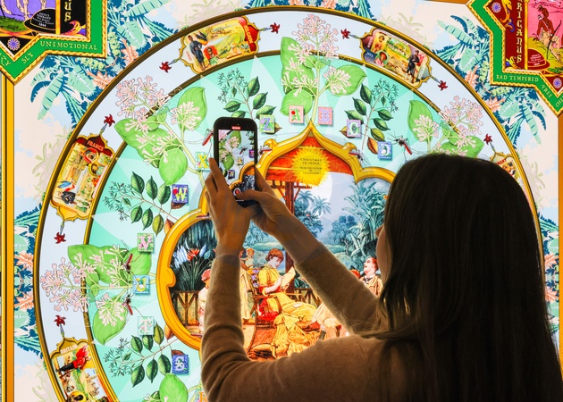 London, UK. 09th Oct 2025. TA visitor takes photos of 'Cinchona: What's in a Name', 2025. At the Shirley Sherwood Gallery of Botanical Art, Kew Gardens, new exhibitions recover the lost stories of remarkable artworks and illuminate traditional Indian art. New lightbox works from acclaimed artists The Singh Twins are on display to the public for the first time., Credit:Imageplotter / Avalon