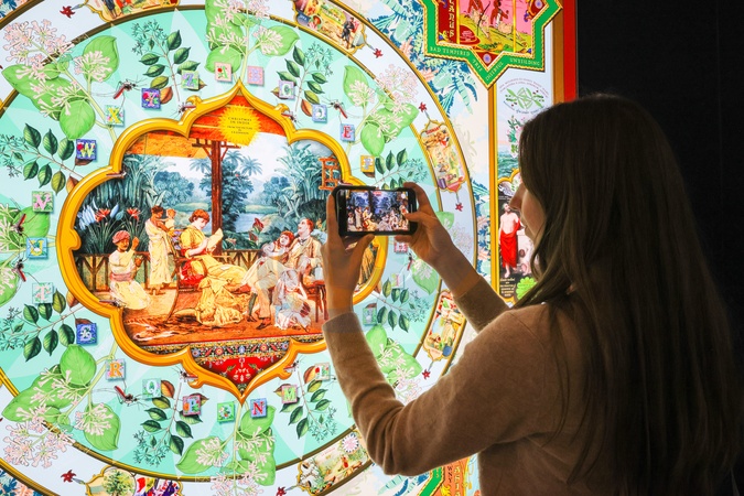 London, UK. 09th Oct 2025. TA visitor takes photos of 'Cinchona: What's in a Name', 2025. At the Shirley Sherwood Gallery of Botanical Art, Kew Gardens, new exhibitions recover the lost stories of remarkable artworks and illuminate traditional Indian art. New lightbox works from acclaimed artists The Singh Twins are on display to the public for the first time., Credit:Imageplotter / Avalon