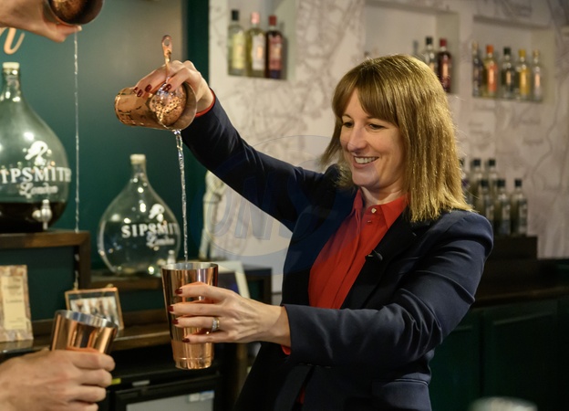 UK Chancellor of the Exchequer Rachel Reeves mixes gin with company co-founder and Master Distiller Jared Brown as she visits the Sipsmith Distillery to highlight how the India Free Trade Agreement is supporting British Business, Chiswick, London, 09 October 2025., Credit:Paul Grover / Avalon