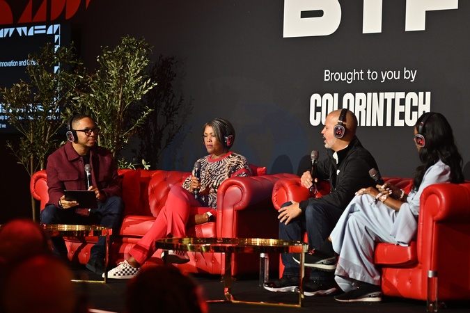 A panel discussion from (L to R) Dion McKenzie, Kumari Williams, Alex Rodriguez and Claudette Bedeau at BlackTechFest 2025 on 9th October 2025, Drumsheds London, UK, Credit:Thepinkrosephotographyltd / Avalon