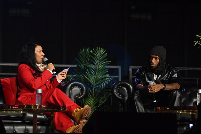 In conversation with Krept (R) (co-founder of Nala's Baby) and host Charmaine Heydon (L) at BlackTechFest 2025 on 9th October 2025, Drumsheds London, UK, Credit:Thepinkrosephotographyltd / Avalon