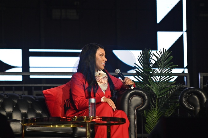 In conversation with Krept, host Charmaine Heydon (L) at BlackTechFest 2025 on 9th October 2025, Drumsheds London, UK, Credit:Thepinkrosephotographyltd / Avalon