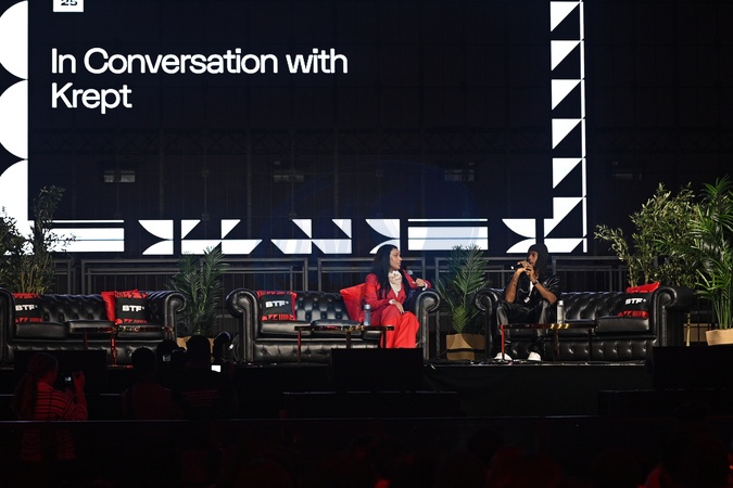 In conversation with Krept and host Charmaine Heydon (L) at BlackTechFest 2025 on 9th October 2025, Drumsheds London, UK, Credit:Thepinkrosephotographyltd / Avalon