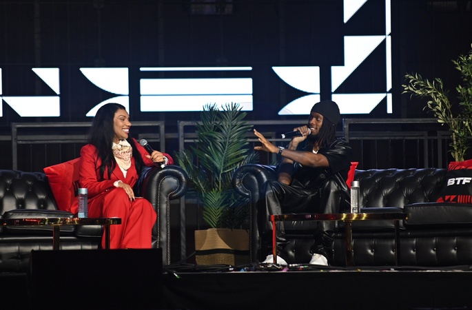 In conversation with Krept and host Charmaine Heydon (L) at BlackTechFest 2025 on 9th October 2025, Drumsheds London, UK, Credit:Thepinkrosephotographyltd / Avalon