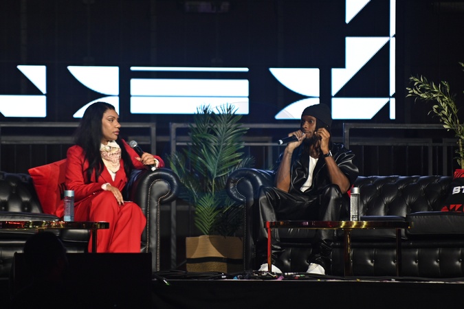 In conversation with Krept and host Charmaine Heydon (L) at BlackTechFest 2025 on 9th October 2025, Drumsheds London, UK, Credit:Thepinkrosephotographyltd / Avalon