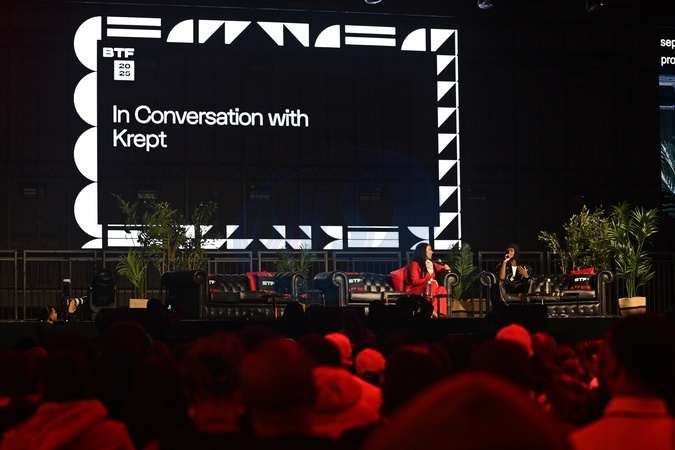 In conversation with Krept and host Charmaine Heydon (L) at BlackTechFest 2025 on 9th October 2025, Drumsheds London, UK, Credit:Thepinkrosephotographyltd / Avalon
