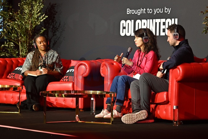 Adetola Adeleke (L) in conversation with Payal Jain and Mark Tiley at BlackTechFest 2025 on 9th October 2025, Drumsheds London, UK, Credit:Thepinkrosephotographyltd / Avalon